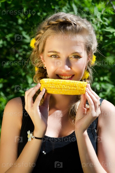 Портрет красивой молодой женщины, кушающей кукурузный початок на свежем воздухе