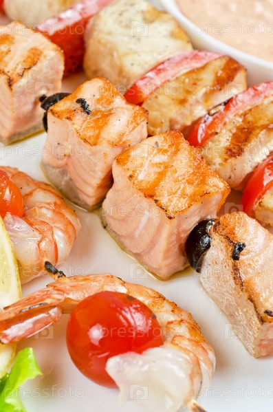 Жареные лосось и креветки с помидорами и перцем на бамбуковых палочках