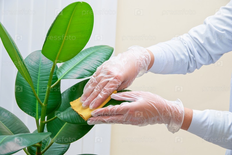 Руки на перчатках протирают фикус мокрой губкой