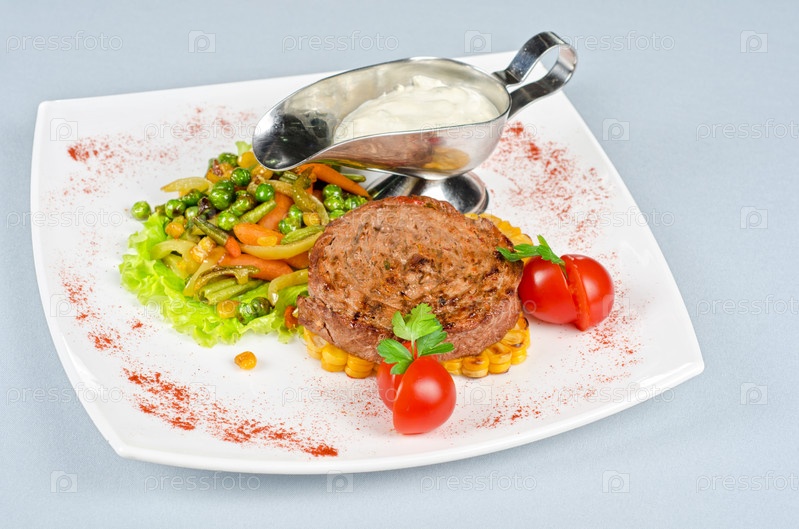 Бифштекс с овощами и соусом