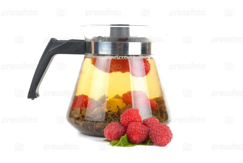 Заварочный чайник с фруктовым чаем и ягодами на белом фоне