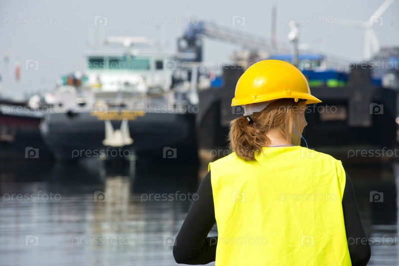Женщина-докер смотрит на гавань с пришвартованными грузовыми судами