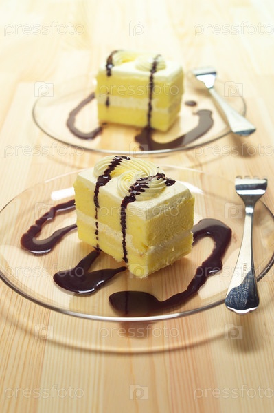 Свежее пирожное с шоколадным сиропом крупным планом