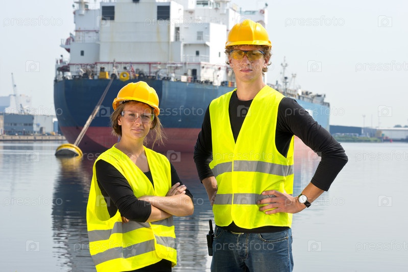 Два докера на фоне огромного грузового корабля, пришвартованного на якорь в промышленном порту