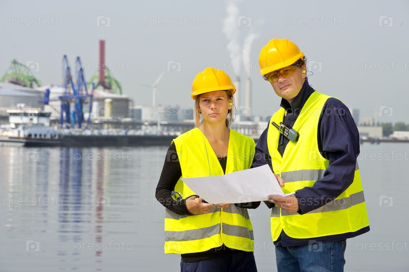 Два работника порта обсуждают чертежи строительства в промышленном порту