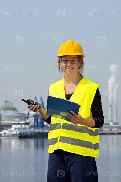 Женщина в шлеме и защитных очках стоит в промышленном порту и говорит по рации, глядя на заметки
