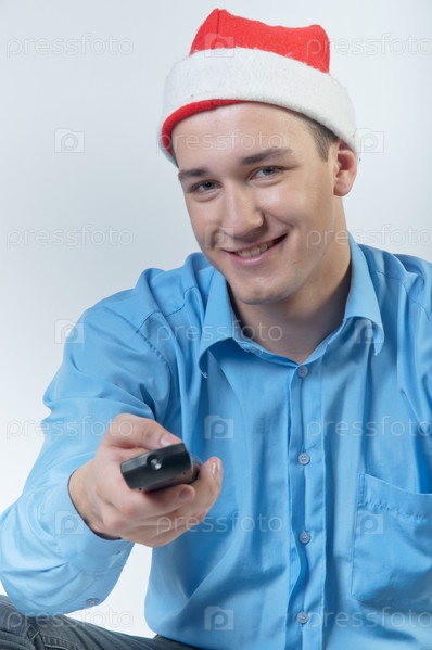 Молодой и симпатичный мужчина в красном праздничном колпаке и голубой рубашке на белом фоне, смотрит рождественские телепередачи, держа в руке пульт от телевизора