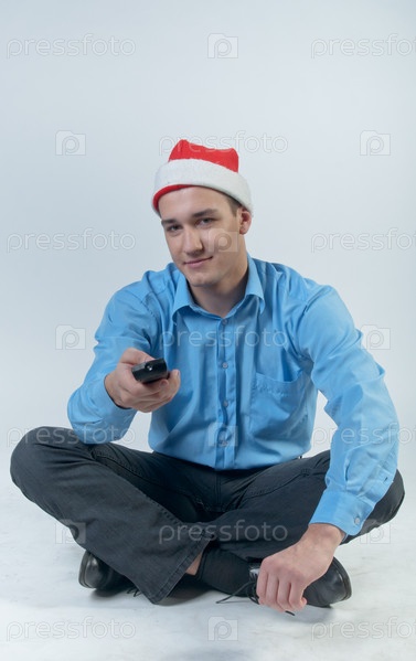 Молодой и симпатичный мужчина в красном праздничном колпаке и голубой рубашке на белом фоне, смотрит рождественские телепередачи, держа в руке пульт от телевизора