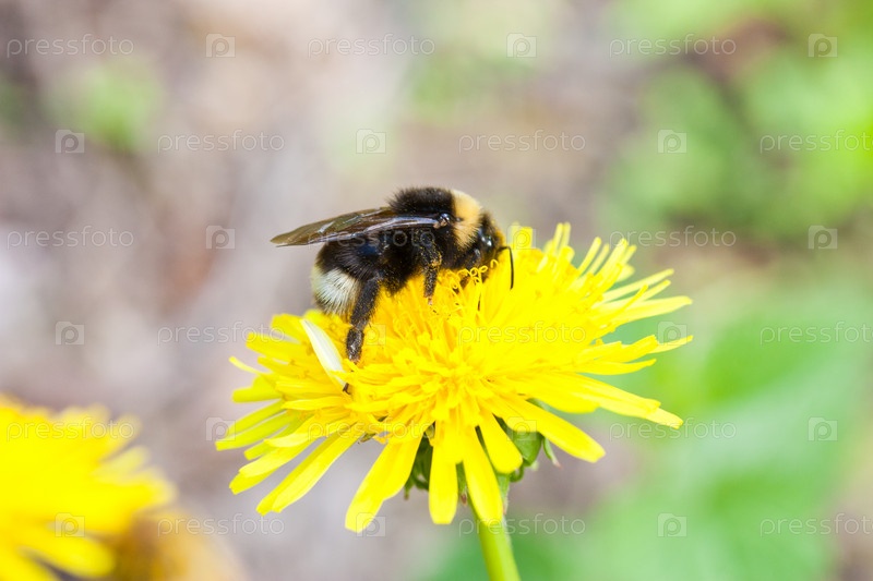 Шмель на желтом одуванчике крупным планом