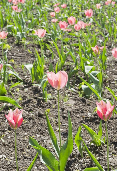 Поле розовых тюльпанов летом