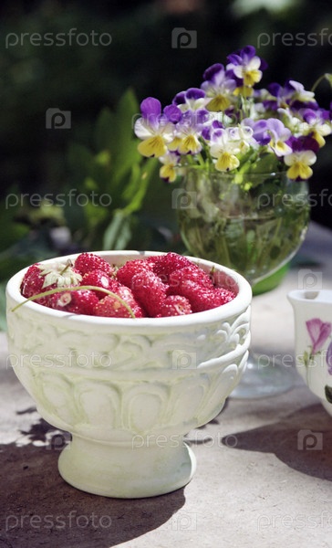 Земляника и букет фиалок в бокале