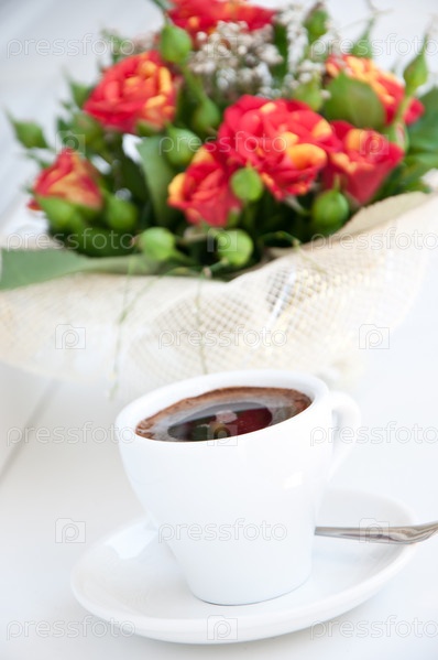 Небольшой букет из роз и чашечка кофе