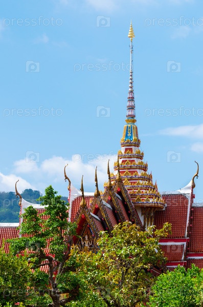 Крыша буддийского храма и зеленые деревья на фоне голубого неба