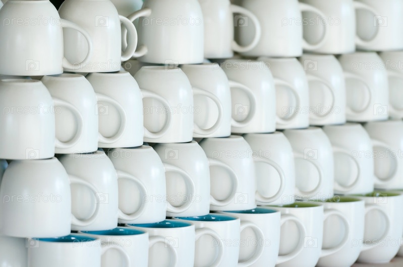Магазинный прилавок с рядами белых чашек. Мелкая глубина резкости с выборочным фокусом на левой трети изображения