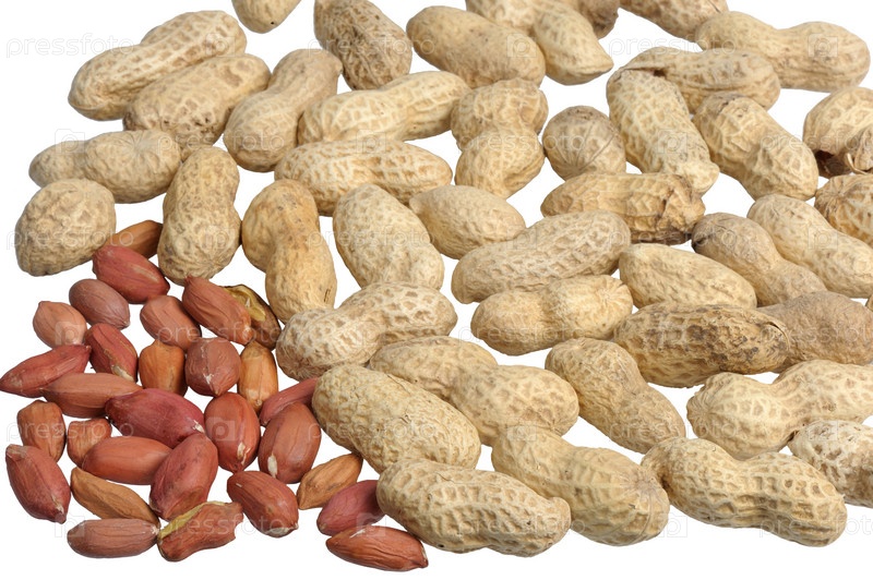 Горсть очищенного и неочищенного арахиса на белом фоне