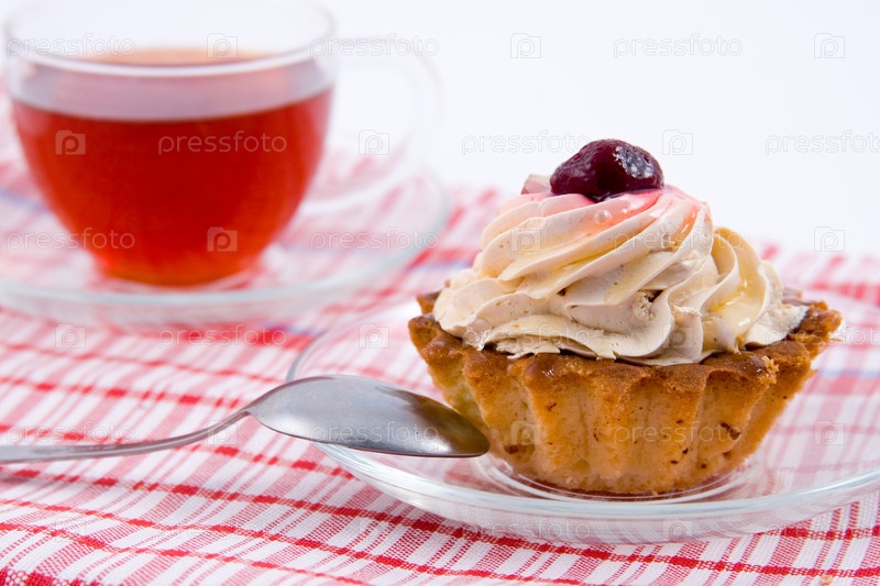 Пирожное и чашка чая на белом фоне