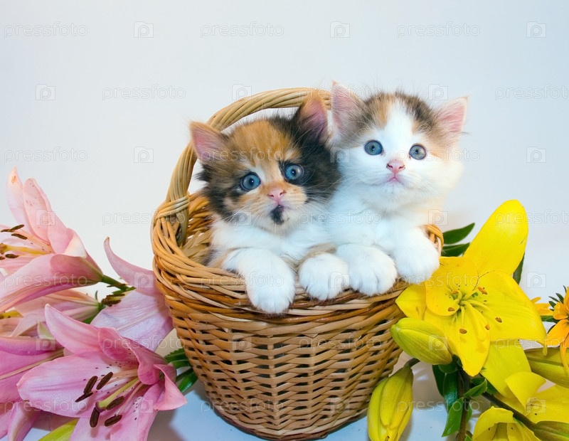Маленькие котята в корзине и цветы на синем фоне