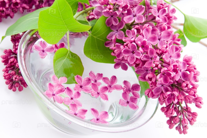 Сирень и миска воды на белом фоне