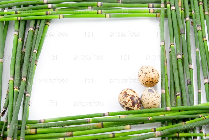Рамка из стеблей и пасхальные яйца на белом фоне