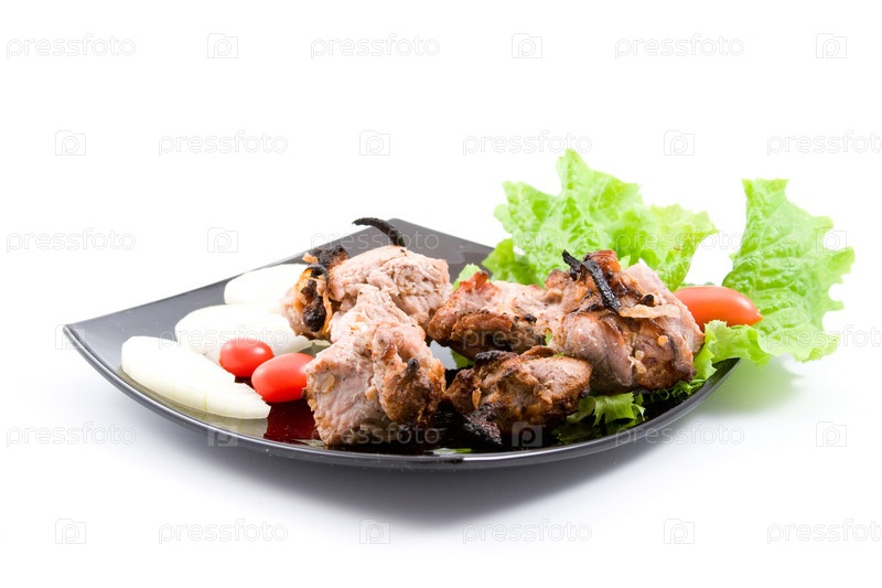 Шашлык с овощами на черной тарелке