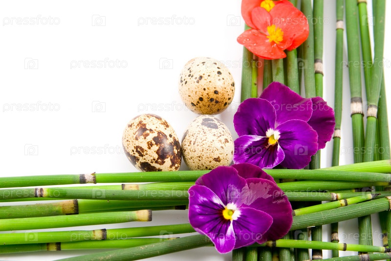 Рамка из стеблей и пасхальные яйца на белом фоне