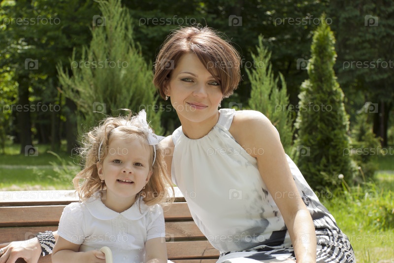 Счастливая мама с дочкой сидят в парке на лавочке