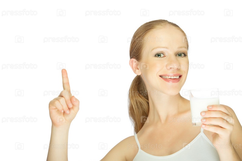 Здоровая красивая девушка со стаканом молока, изолированная на белом фоне