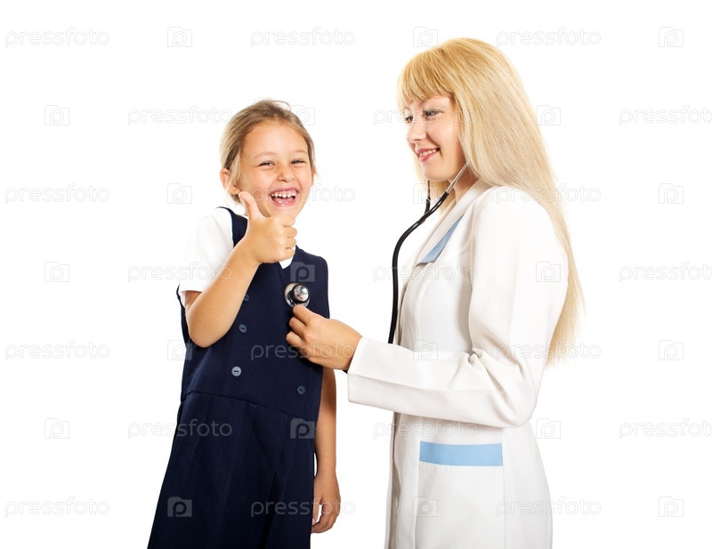 Женщина-врач в белом халате слушает стетоскопом маленькую девочку, показывающую большой палец как знак, что все хорошо