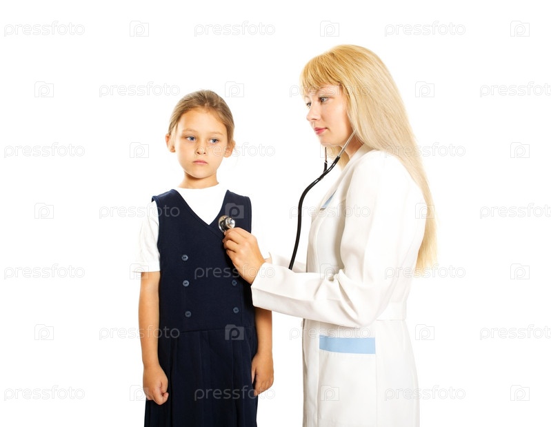 Женщина-врач в белом халате слушает стетоскопом маленькую девочку