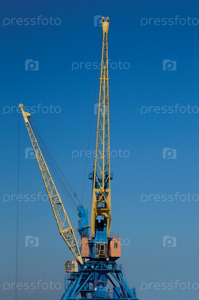 Кран стреловой с основным блоком и стрелами на фоне ясного голубого неба