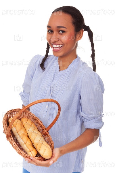 Красивая девушка смешанного происхождения с хлебом в корзине, изолированная на белом фоне