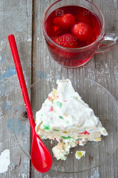Кусок торта, чашка красного чая с клубникой и длинная красная ложка на деревянной доске