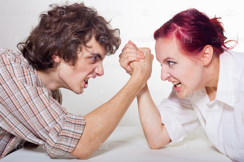 Молодая пара борется на руках на светлом фоне. Портрет крупным планом