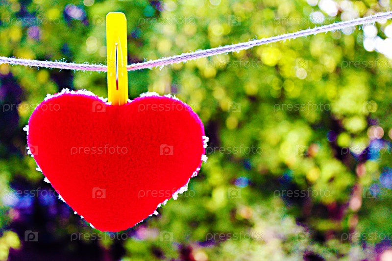 Красное сердечко сушится на веревке