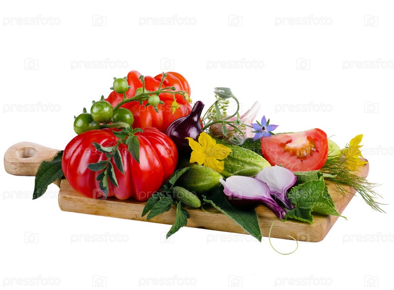 Ассорти из овощей на деревянной доске изолированно на белом