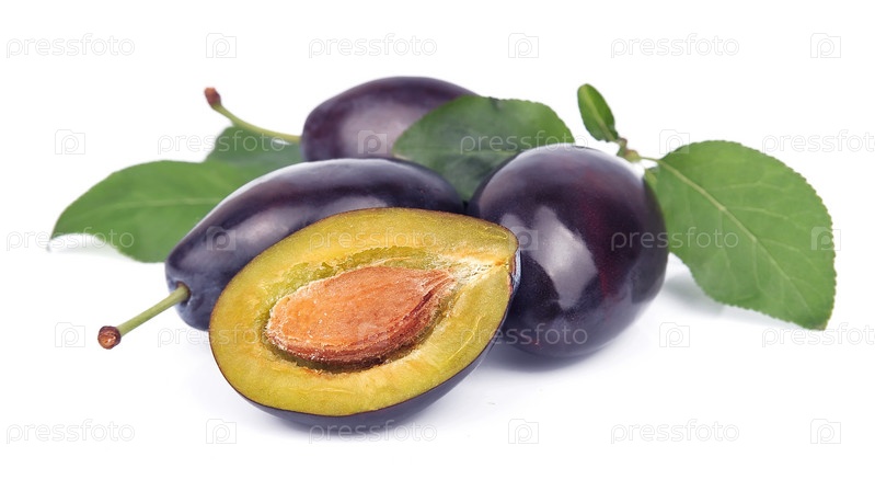 Спелые сочные сливы с листьями на белом фоне