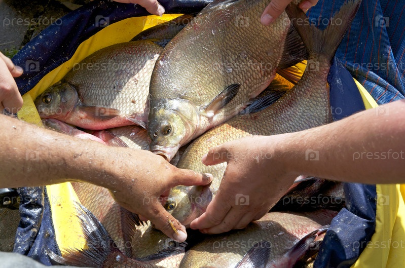 Рыбаки держат рыболовную сеть с большими лещами
