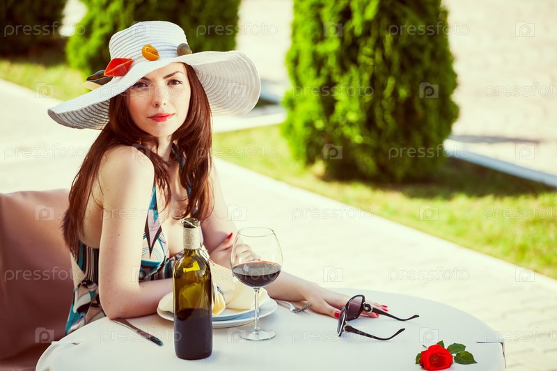 Молодая женщина с макаронами на шляпе в ресторане