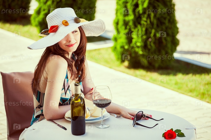Молодая женщина с макаронами на шляпе в ресторане
