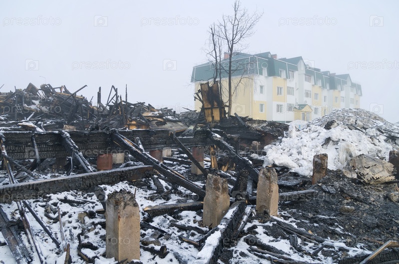 Пожарище с вновь построенным домом на заднем плане