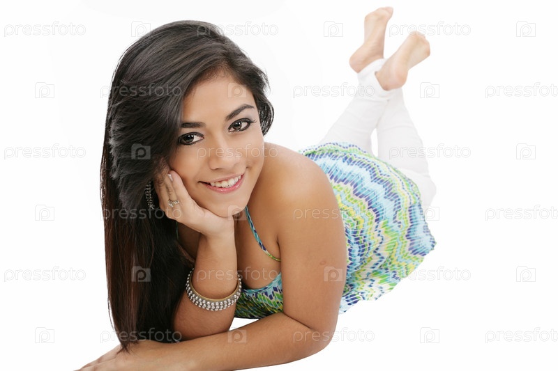 Портрет улыбающийся молодой женщины, лежащей на полу на белом фоне