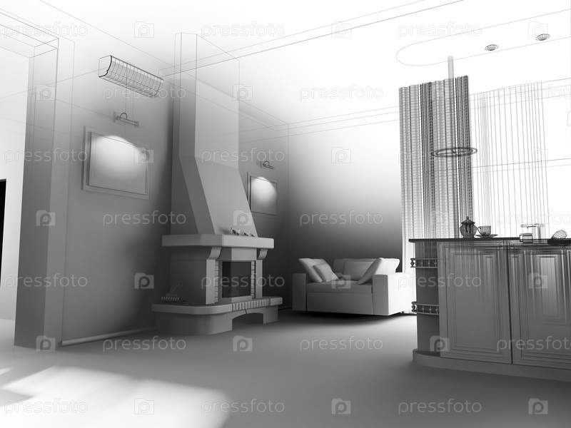 Современный интерьер кухни с камином (монохромное изображение)