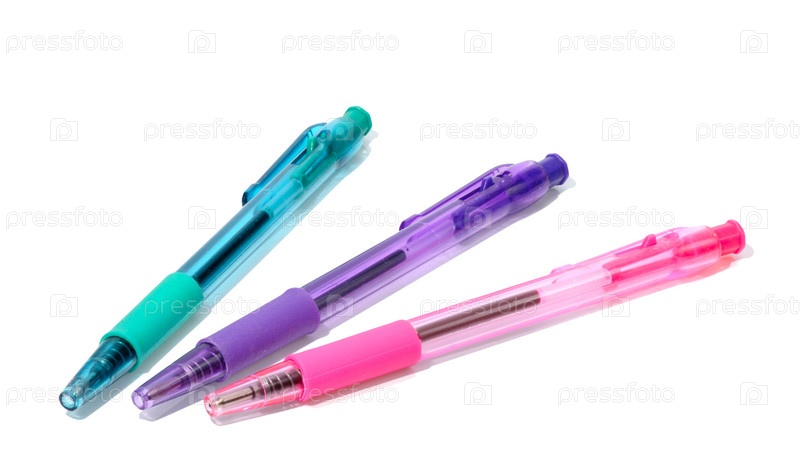 Три разноцветные шариковые ручки на белом фоне