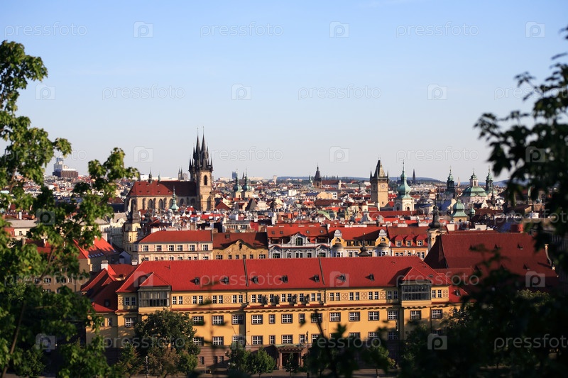 Вид на красные крыши и высокую готическую башню между зелеными листьями. Прага, Чешская Республика