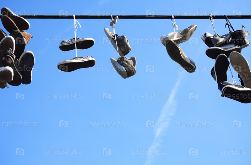 Ношеная обувь висит на проводе на фоне голубого неба