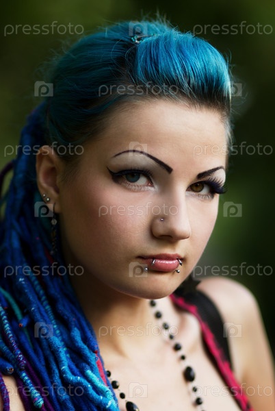 Стильная девушка-панк с пирсингом и разноцветными глазами позирует на свежем воздухе