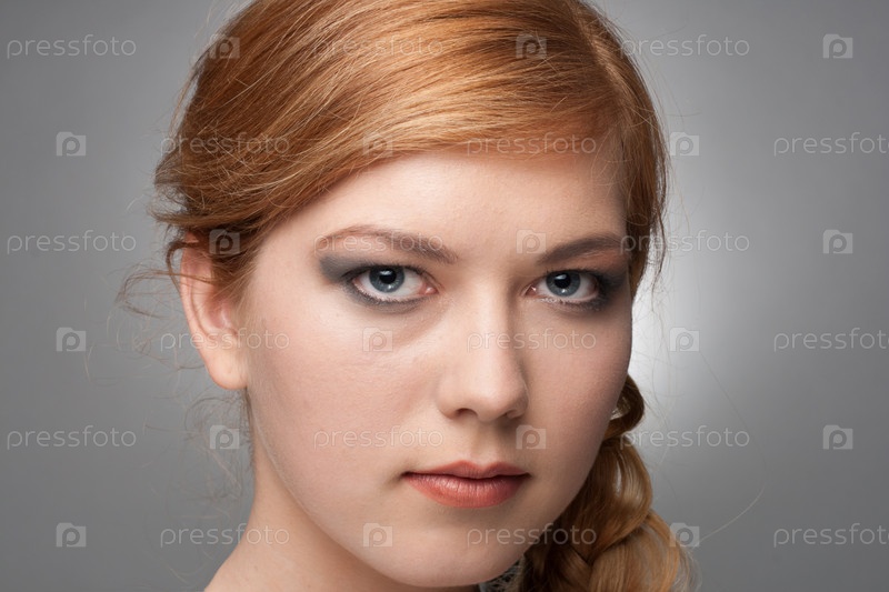 Портрет молодой красивой девушки на сером фоне