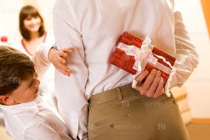 Задний вид мужчины, держащего коробку с подарками в руке со своим сыном рядом, пытаясь посмотреть на нее