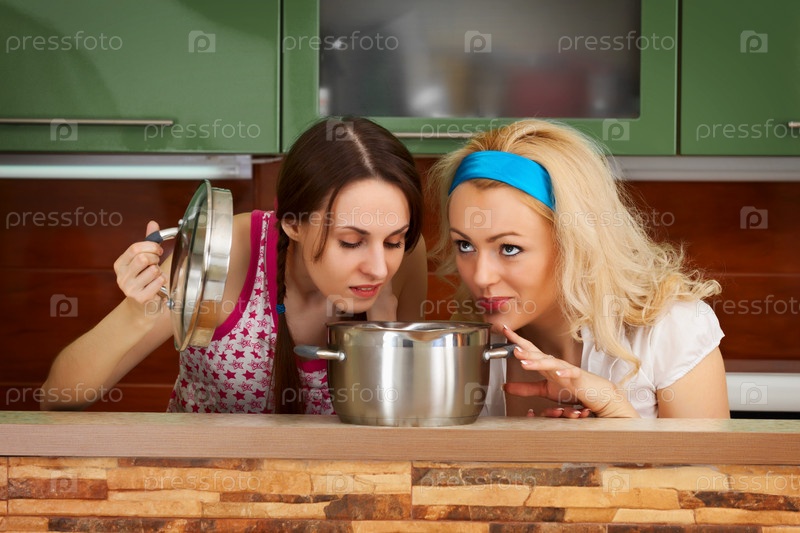 Две молодые женщины с кастрюлей супа