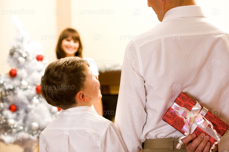 Задний вид мужчины, держащего в руке коробку с подарками вместе со своим сыном рядом